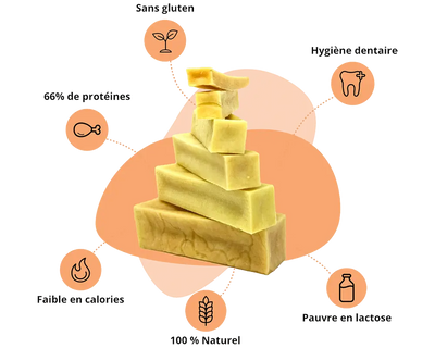 Le fromage dit de yak pour chien Cheezy Dog est une friandise à mâcher 100 % naturelle, résistante, sans additif ni gluten, inspirée d’une tradition himalayenne mais fabriquée localement à base de lait de vache européen. Riche en protéines, faible en lactose, il favorise l’hygiène bucco-dentaire, occupe ton chien, et se digère facilement.